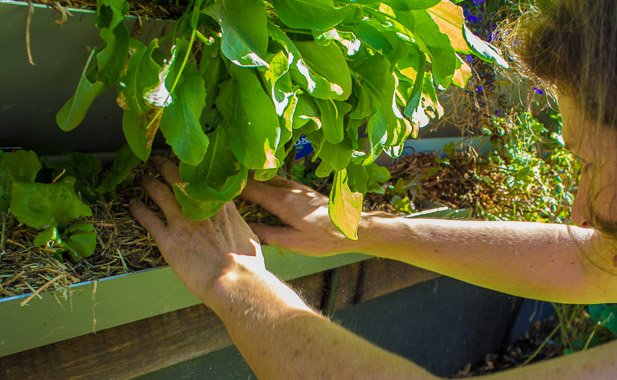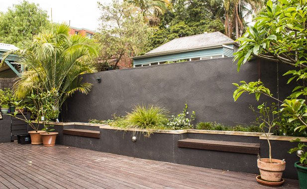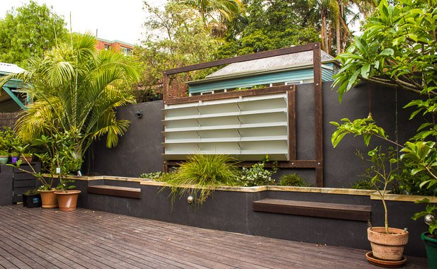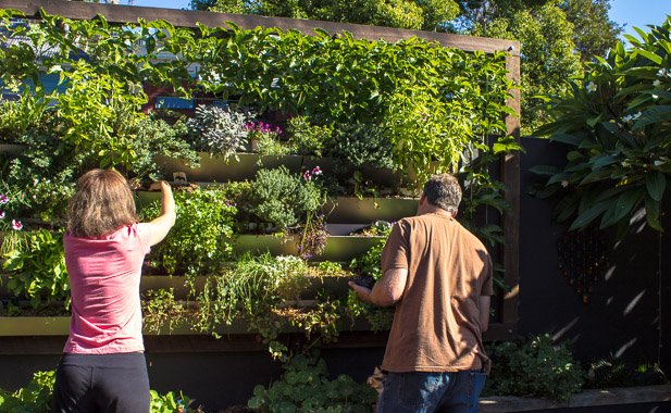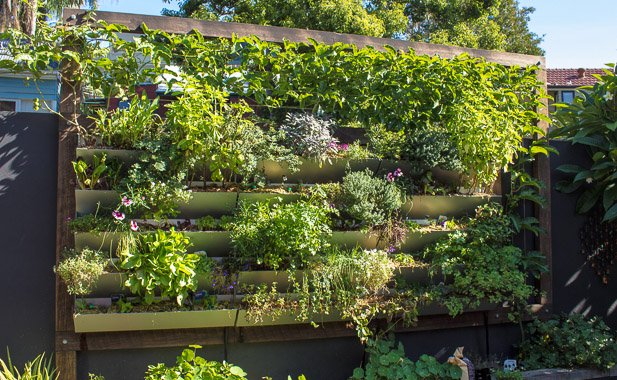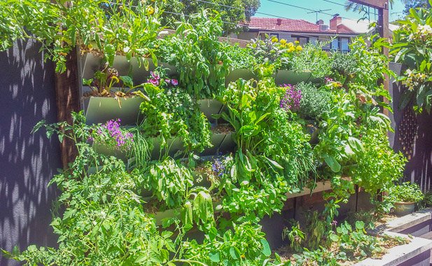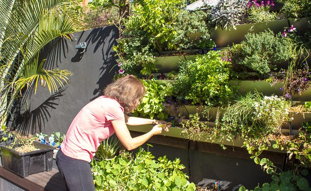 Fiona's courtyard at Rozelle is a "work of art that I can eat from", since we created this vertical garden with Vgarden SlimRacks framed by gorgeous recycled timber. The north facing wall produces masses of fresh organic veggies and herbs that Fiona, a nutritionist eats every day.