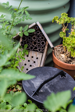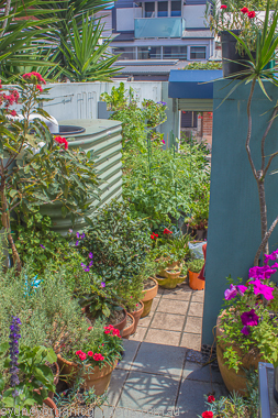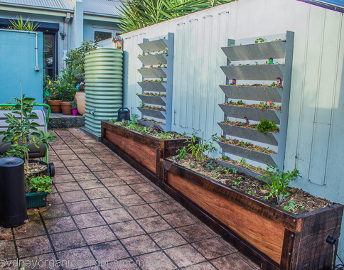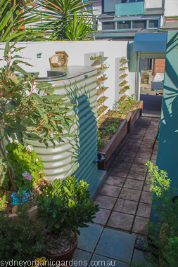 Ric loves growing his own organic food, and had a north facing wall in his courtyard in Alexandria, Sydney. We designed and built a water passive raingarden system with water tank, wicking beds, vertical gardens and built in worm farm. The garden is self watering, self feeding, and thrives - pumping out masses of tasty herbs, veggies & fruit for Ric and his partner Amanda.